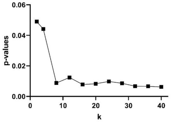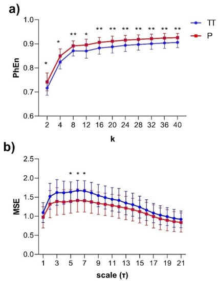 The subjects’ curve profiles (mean ± SD) of PhEn for TT (continuous blue line) and P (continuous red line) for the range are shown in Figure 4a. We found significantly higher mean values of PhEn for P compared to TT for all k values (p < 0.05, Figure 4a). There is a tendency of increasing differences between both conditions with higher values; lower p-values (p ≤ 0.007) were found for (Figure 5). Additionally, Figure 4b shows the curve profiles calculated by MSE with the SampEn estimator, at TT and P. Contrary to the PhEn results, the MSE revealed significantly higher mean values for TT in comparison with P (p < 0.05, for scales τ = 5–7). This relevant finding seems to confirm that PhEn and MSE provide different information. By comparing p-values between both entropy methods, PhEn seems to be more appropriate than MSE to identify differences between TT and P.