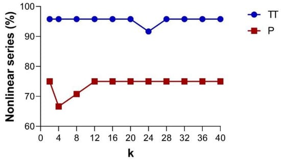 Based on the PhEn, Figure 6 shows the percentage of nonlinear series as a function of the k value found in the TT and P conditions, as indicated by the phase-randomized surrogate test [24,25]. The graphs distinguish the percentage of nonlinear dynamics in TT (continuous blue line) and P (continuous red line). From this figure, it is noted that the time series of the TT condition show a larger number of cases exhibiting nonlinear dynamics in comparison with those of the P condition. We observed significant differences (p < 0.05) in the number of cases with nonlinear dynamics at any k value (except for k = 24) between TT and P. Additionally, it is important to note that the percentage of nonlinear series found for both conditions are quite similar at different k values.