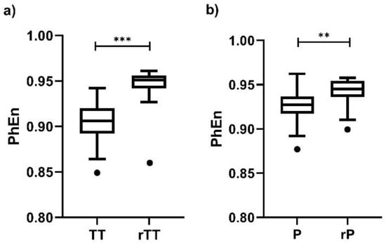 Finally, we found differences between the time-reversed and the original EHG time series for all values; the individual result for is presented in Figure 7. Interestingly, the differences are more discernable in TT vs. rTT (Figure 7a, p < 0.0001) than in P vs. rP (Figure 7b, p < 0.002), but at both conditions the PhEn values are affected by changing the time order of the original time series.