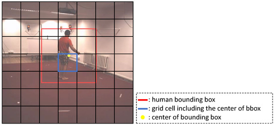 Our goal is to reconstruct the 3D shapes of multiple persons based on the camera coordinate system from a single RGB image in a single-shot manner. We were inspired from the ideas of the existing single-step object detection methods [29,30,31] to reconstruct the 3D shapes of multiple persons in a single-shot manner. Similarly to those methods, our network produces an output tensor divided by a grid of size . Figure 2 shows an example of a grid representation used in this paper. If the center (yellow dot) of the human bounding box (red rectangle) is located within a grid cell (blue rectangle), then the network should predict that the grid cell contains a subject.