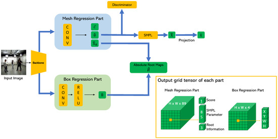 Figure 3 shows the structure of the proposed network that can be trained in an end-to-end fashion. First, the backbone network extracts the convolutional features from the input single RGB image. Then, the extracted features are simultaneously fed into the mesh regression part (MRP) and the box regression part (BRP). The outputs of the MRP are as follows: (1) score maps to indicate the probability that each grid cell will contain the subject; (2) mesh maps that contain the pose, shape, and camera parameters of the SMPL model; and (3) root maps including the root joint information, where the first two channels represent offset from the top-left corner of the grid cell where the center of the bounding box is located to the root joint, and the last channel represents the correction factor which refines the estimated camera distance as in [10]. The predicted mesh maps are fed into the adversarial discriminator network, which determines whether the estimated parameters are real using the large dataset of 3D human meshes [32]. The discriminator network allows the SMPL parameter in the grid cell where the subject is located to generate a valid 3D human shape and weakly supervises in-the-wild images without the 3D ground-truth. Moreover, we assume that no bounding box information is given as input because the proposed method reconstructs the 3D shape in a single-shot fashion. Therefore, we let the network predict the bounding boxes additionally to calculate the camera distance of the root joint. The output of the BRP is as follows: bounding box maps , where the first two channels represent the offset from the top-left corner of the grid cell where the center of the bounding box is located to the center of the bounding box, and the other two channels represent the width and height of the bounding box.