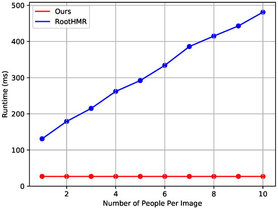 Runtime measurement results. The runtime of the proposed network is constant regardless of the number of persons in the video because the proposed method reconstructs the 3D shapes of all persons in the image in a single step from the grid cells obtained by a single feedforward operation. By contrast, the top-down baseline method first uses a human detector to detect persons in an input RGB image, and then crops the detected area and feeds each into a single-person pose estimator. Therefore, in the top-down baseline method, the runtime increases as the number of persons detected in the image increases. In this experiment, the Mask R-CNN model with ResNeXt-101-32 backbone, which was pre-trainined using the MS-COCO dataset, was used as a human detector. Figure 5 shows the results of the runtime comparison with RootHMR. The proposed method had a constant runtime of about 27ms regardless of the number of persons, but the baseline method required additional runtime for the human detector, and runtime increased proportionally as the number of persons increased. Considering the real-time scenario, the baseline method does not process images in real time, but the proposed method processes images at about 37 fps and operates in real time.