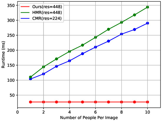 Figure 6 shows the results of runtime comparison with state-of-the-art methods that reconstruct the 3D human shape in a top-down fashion. We downloaded publicly available codes for HMR (https://github.com/MandyMo/pytorch_HMR) [1] and CMR (https://github.com/nkolot/GraphCMR) [40], which were run under the same conditions as the proposed method on our computer. HMR and CMR require additional runtime for human detection, and runtime increases proportionally as the number of persons in the image increases because each area cropped from the human detector is fed into the single-person shape reconstructor. By contrast, the proposed method has a constant runtime of about 27 ms regardless of the number of persons and outperforms state-of-the-art methods in terms of runtime.