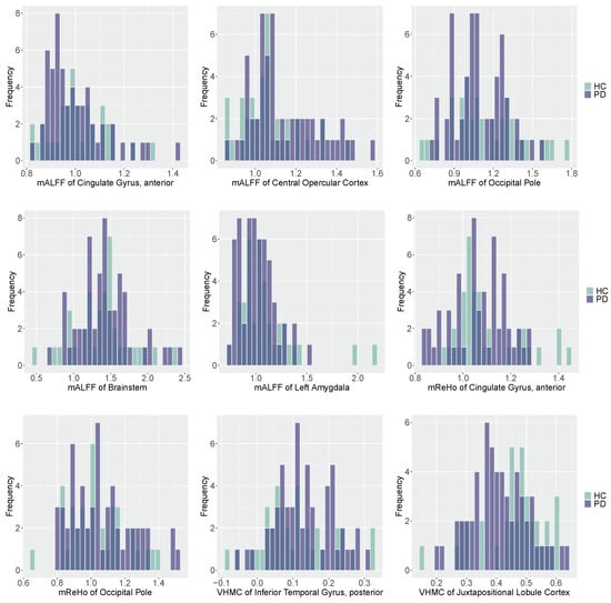 Histograms of selected radiomic features for PD and HC subjects with darker color representing overlapping values. Purple: PD group; Green: HC group.