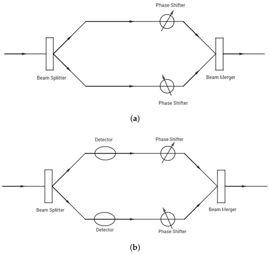 Schematic two-beam interferometer. (a) two-beam interferometer without which-way detectors. The input beam is split into two beams by the beam splitter, phase-shifted by the phase shifters, and then recombined by the beam merger to produce the output beam; (b) two-beam interferometer with which-way detectors. Detectors are placed on the path of each beam to acquire which-way knowledge, adapted from Reference [5].