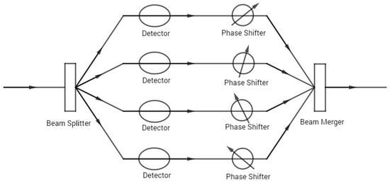 where D is the path distinguishability, a measure of the particle nature, and V is still the fringe visibility, a measure of the wave nature. Although formally similar, the wave–particle duality relation in Equation (2) has a very different interpretation from that in Equation (1). The distinction lies in how the particle nature is characterized. In contrast with the path predictability P that represents the a priori which-way knowledge, the path distinguishability D represents the a posteriori which-way knowledge, gained retrodictively from measurements performed with which-way detectors interacting with the quanton. As a result, the path distinguishability is not only determined by the quanton, but also depends on the detector [5]. By contrast, the path predictability is determined only by the state of the quanton (related to the setup of the interferometer). The wave–particle duality relation, in the form of , sets a limit on the extent to which the a posteriori which-way knowledge gained with detectors (particle nature) is compatible with the observation of the interference pattern (wave nature). Hence, the message it conveys is different from that in Equation (1). There has been effort to generalize both versions of the wave–particle duality relations to multi-beam interference experiments (corresponding to quantum systems with multi-dimensional Hilbert spaces) [7,8,9,10,11,12,13,14]. A schematic four-beam interferometer is shown in Figure 2.