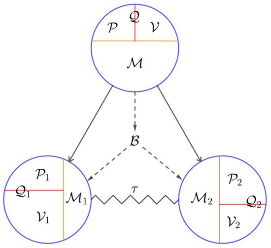 where () as before, with , and the bar notation still represents the equal-weight average, i.e., . Here, is the mixedness of the bipartite system, while is the mixedness of the subsystem k, where the mixedness is defined by Equation (17).