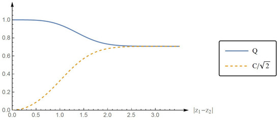 In addition, when the two-qubit system is in a mixed state, the concurrence C of the two-qubit system in general is no longer equal to the mixedness of the single qubit. In fact, the combination of the purity–mixedness complementarity in Equation (12) with the local-nonlocal complementarity for mixed states in Equation (7) yields the following entanglement–mixedness relation for mixed states [20]:
