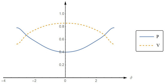 The local complementarity relation shows that the predictability (particle nature) and the visibility (wave nature) are two complementary aspects of the purity (quantum nature). To visualize this complementarity relation in this particular example, we consider the more specific case with and (). Then, in this case, . According to the expression of in Equation (113), this implies