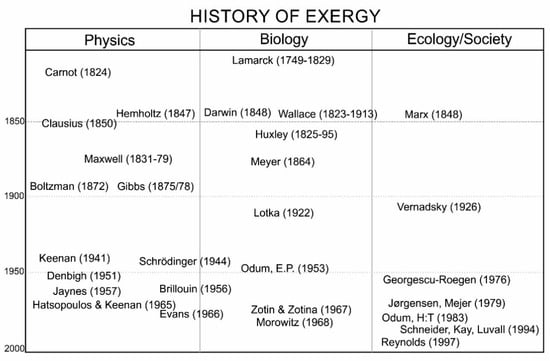 Meanwhile, it took some years to implement these ideas to the level of ecology and ecosystems. First, ecological science needed to build up knowledge. Second, the systems approach, the introduction of general systems thinking [,] to ecology, was needed. An outline of historical events, within the science of physics and biology, as well as society, considered to be important to the application of thermodynamics in ecology is shown in Figure 1. Events are indicated by authors placed in diagram in accordance with indications of approximate time of events and area of contribution.