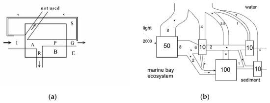 (a) A universal energy diagram according to E.P. Odum [,]. The components are: ingested energy, I, energy not used, NU, energy assimilated, A, production, P, respiration, R, growth, G, energy stored, S, and energy excreted, E. All functions carried out by biomass, B. (b) An energy flow diagram for a marine bay ecosystem showing the energies flowing through the grazing chain in the water column and entering the sediments, respectively. Both diagrams have been redrawn and modified after Odum [].