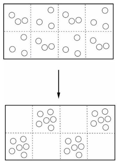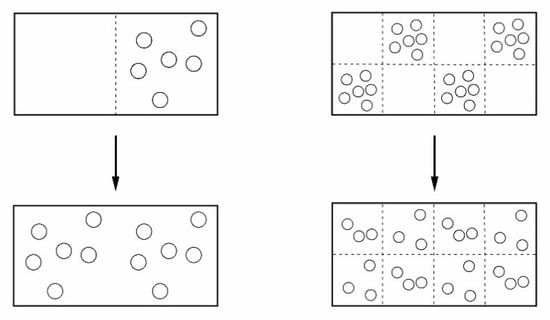 These (e.g., Katchalsky and Curran []) are systems which as the term says are totally isolated from the surroundings. This means that they receive or exchange no fluxes of neither energy nor matter to or from the systems. Hence, their evolution—according to the second law of thermodynamics—can take place in one direction only, towards increasing entropy, i.e., towards the state of highest probability and degree of randomness. This type of systems may be illustrated by Figure 4, Figure 5 and Figure 6.