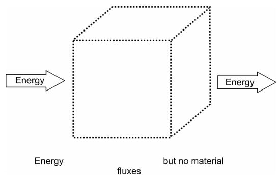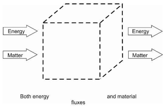 These are systems that are open to both energy and matter fluxes. Living systems are typical examples of this. The energy flows in these (biological) system are “used” to distribute and organize matter into structure by processes of self-organization, e.g., Popovic []. Energy loss through dissipation as mentioned above is unavoidable due to irreversibility of processes. Material losses are unavoidable too but are supposed to strive at a minimum, to a level dictated by necessity or forcing functions. The difference from the other systems may be illustrated by Figure 6.
