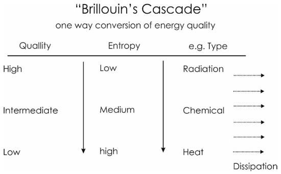 Transformation of energy through “Brillouin’s cascade”. Energy is always transformed in one direction only, from high quality, like radiation, to a sequentially lower quality, ending up as its lowest quality form, namely heat, i.e., ending up as dissipated energy as result of the irreversibility of processes.