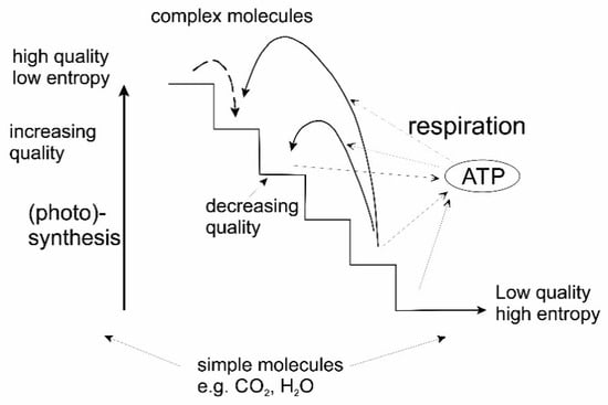 Although early authors like Lotka [,,] were aware that energy and competition for this resource play a fundamental role to living systems, it took some more years before a fundamental dilemma was solved. The fact that living, ordered systems were able to exist and even grow, based on irreversible processes that continuously lead to an increase in entropy and disorder, seemed to be self-contradictory, constituting a dilemma. The puzzle was solved by the argument that something else had to be involved—something able to decrease the entropy of the system. Logically this “something” needed to have a negative value and was therefore referred to as negentropy []. A better view may in fact be that the entropy produced is exported to the environment, thereby keeping the net balance negative—at least locally, while processes going on in the system at the same time leads to a gross positive entropy production [,,].