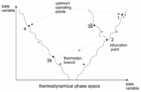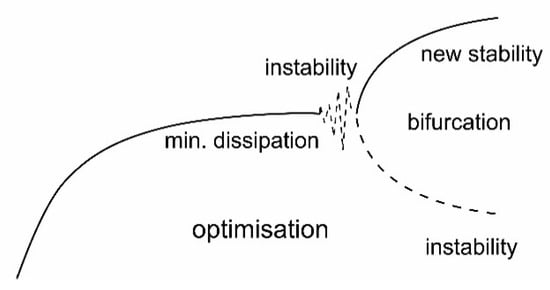Hereafter, the extension of the thermodynamic laws to far from equilibrium conditions is described (Section 5). This includes an introduction to the Prigoginean world views of living systems as dissipative structures, (Section 5.1) [] that move toward a state of minimum dissipation (Section 5.2) and evolve through instabilities and bifurcations (Section 5.3). By the introduction of the hypothesis of the minimum dissipation principle we are moving in the direction of extremal principles to biological systems [,,,,,]. Later this principle has been criticized [,] and additional proposal describing ecosystems tendencies to obey a principle of maximum entropy production has been introduced []. The extension has led to several candidates for new laws or principles within thermodynamics. The question is whether we are dealing with a new ecological law of thermodynamics (Section 5.4)