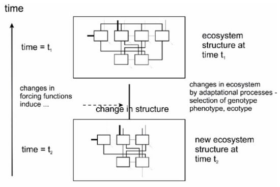 This type of questions has received an increasing attention from ecological researchers and has been addressed within the area of ecosystem theory by Müller and Leupelt []. To deal with ecology from a theoretical point of view is nothing new, but research has usually been carried out at species or population level, for instance May’s analyses of the relation between diversity and stability []. Raising these problematics to the ecosystem level does not only offer new challenges but determines also a considerable change in the character in the complexity of the problem and in the questions to be answered. Introduction of thermodynamics into ecosystem studies makes these aspects even more relevant [,,,].