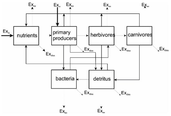 - Aoki, I. Exergy analysis of network systems at steady state. Ecol. Model. 1992, 62, 183–193. [Google Scholar] [CrossRef]