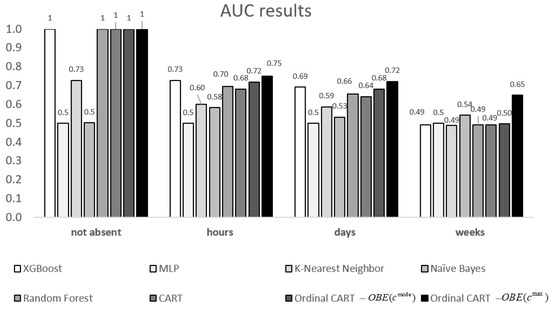 Figure 1 illustrates the AUC values obtained for each absenteeism class for each model. Let us focus on the highest absenteeism class (“weeks”), as it is important to identify the characteristics of those who are most susceptible. It can be seen that the ordinal CART yields significantly better results for this class than the other models, with an AUC value that is larger than that of its closest competitor—the Naïve Bayes model—by 20% (AUC = 0.65 and 0.54, respectively). The ordinal CART model also achieves the highest AUC values for the “hours” and “days” classes.