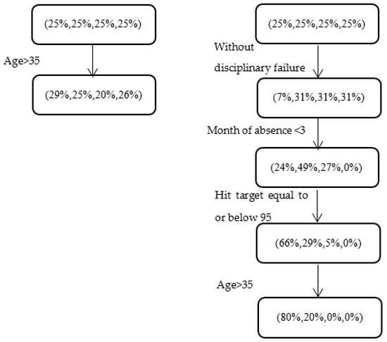 We emphasize that the interpretation of the results of our model should be carried out on a case-by-case basis, using the organization’s human resource management experts. Nevertheless, we offer a possible explanation for this general finding: It could be the case that employees above the age of 35 with performance target rates less than or equal to 95 (note that 58% of the instances in the training dataset had a target rate less than or equal to 95) worry more about their jobs during the initial months of the year than the average employee in this age group; therefore, they exhibit less absenteeism. This pattern, which was easily uncovered by our model, may be also deduced by integrating the following results from previous studies, although this process would be considerably more demanding and time-consuming for human resource managers. (1) A negative correlation between age and absence frequency [4,5,6]; (2) employees who have larger families and greater financial responsibilities are less likely to stay at home as a result of a minor illness [29,30]; and (3) following the logic in [7], employees with lower performance target rates may feel insecure and are thus less likely to be absent from work. When examining a pattern that is the same as that shown on the right-hand side except for a difference at the final level (i.e., the subgroup only includes employees who are younger than 35), the revealed class distribution is (9%, 64%, 27%, 0%), which is significantly different from the (80%, 20%, 0%, 0%) distribution obtained for employees above the age of 35 years. Thus, a possible intervention program would begin by administering a survey to the employees about their commitment to the organization and their attitudes towards improving their performance. The aims of the survey would be to understand the reasons that cause both subgroups to differ in terms of their propensity for absenteeism, and ultimately, to develop a prevention strategy for the younger subgroup.