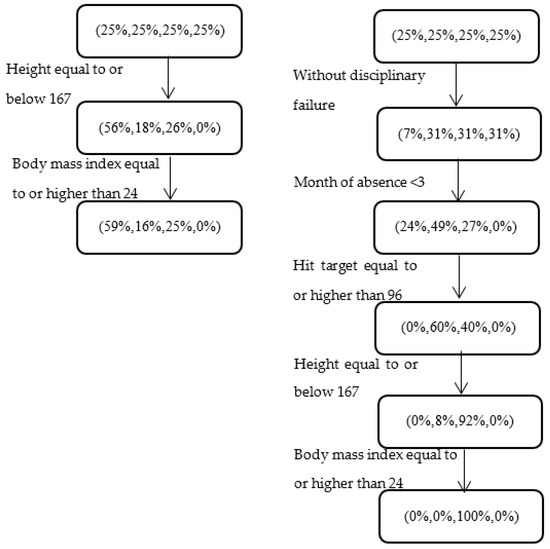 This example was chosen following previous research studies demonstrating a link between body characteristics (e.g., weight and height) and absenteeism. Figure 3 illustrates a correlation between body characteristics and absenteeism and demonstrates the ability of the ordinal CART to discover refined, multi-feature patterns (RHS), as opposed to partitions based only on body characteristics (LHS). Specifically, it can be seen that for the subgroup of employees who are shorter than or equal to 167cm, with a Body Mass Index (BMI) that is equal to or higher than 24, who do not have a disciplinary failure, and who exhibit relatively high performance, the distribution among the absenteeism classes for absences at the beginning of the year is (0%, 0%, 100%, 0%). In other words, all the instances within this subgroup belonged to the class “days”.