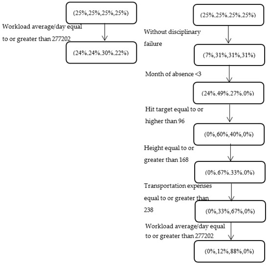 A possible explanation for the discovered pattern may be that overloaded employees who live further from work (as can be deduced from their higher transportation expenses) may gradually burn out and accrue health issues that may lead to absenteeism. The discovered pattern provides additional refinements to previous studies (see, e.g., in [3]) that show that increased workload may be associated with adverse health effects, which, in turn, may lead to increased levels of sickness absence. When examining a pattern that is that same as that on the RHS of Figure 3 but with a difference at the final level (employees with a daily workload that is lower than 277,202), the resulting class distribution of (0%, 67%, 33%, 0%) is significantly different from the (0%, 12%, 88%, 0%) distribution obtained for those with a higher workload. These findings may trigger a discussion about intervention programs that balance workloads or offer flexible work opportunities, such as working from home, which may decrease transportation expenses, save travel time, and potentially increase productivity.