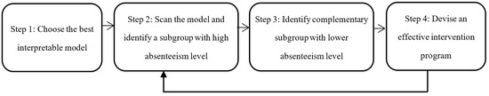 We suggest a general mechanism, based on our classification models, for guiding (a) the selection of employee subgroups that are prone to absenteeism and (b) the development of intervention programs to mitigate this behavior (see Figure 5). The first step is to select the best interpretable model, which was found to be the OBE-based CART model with selected class . In Step 2, an automatic mechanism identifies an employee subgroup with a high likelihood of absenteeism. Next, in Step 3, the mechanism identifies the complementary subgroup with a lower level of absenteeism. This subgroup has the same pattern as the subgroup that was identified in Step 2, but with a different value for the last feature in the pattern. This complementary subgroup, in conjunction with other human resource management best practices, will be used as an inspiration for assembling the intervention program in Step 4. This is because it is assumed that following the intervention, employees within the high absenteeism subgroup will behave more like those in the complementary subgroup, and thus will be less prone to absenteeism. The examples above (which refer to 3 out of 123 patterns yielded by the model) illustrate how human resource managers can use the suggested approach for reducing absenteeism.