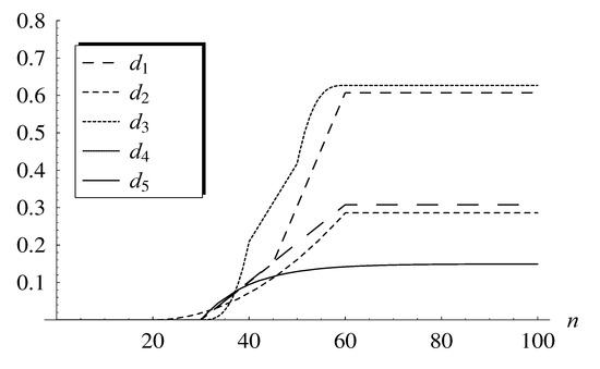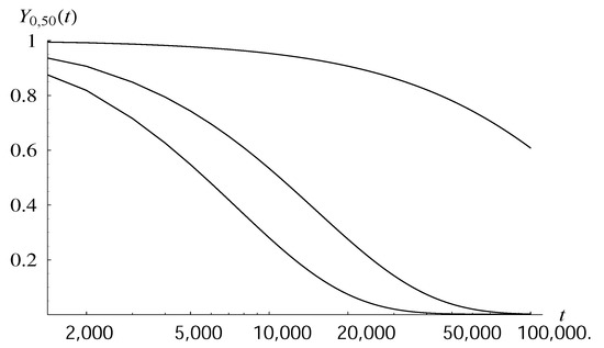 The detailed dependence of the probability of not reaching 50 by the time t is depicted as a function of t in Figure 2, for three selected dropping functions. We see a very different transient performance in each case. For instance, probability 0.6 of not crossing 50 corresponds to the time interval of length about 8000 in the case of , of length about 4300 in the case of , and of length over 100,000 in the case of .