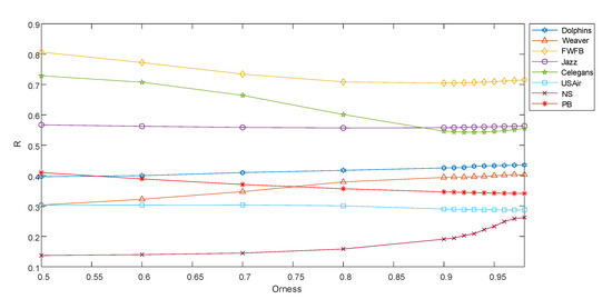 The results in Figure 4 show that the selection of parameter has different effects on the performance of on eight networks. The larger the parameter is, the more emphasis is placed on the individual index at the top of the ranking. With the increase of , the R value of in Dolphins and Celegans networks decreased significantly, but it increased in NS and Weaver networks.