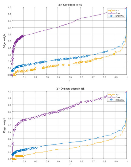 Therefore, we assume that the first 10% of the edges in the LEWF attack sequence of Cos+ are the key edges, represented by pentagram star, and mark the corresponding positions of these edges in the attack sequence of ACT and , as shown in Figure 6a. Similarly, the first 10% of the edges in the LEWF attack sequence of ACT are assumed to be ordinary edges, represented by inverted triangles, and the corresponding positions of these edges in the attack sequence of Cos+ and are marked out, as shown in Figure 6b.