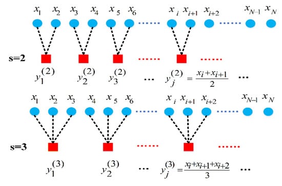 Step 1: Constructing the coarse-grained time series. Given a time series of length N, the coarse-grained time series is constructed by time scale factor s. The coarsening process of the time series with scale factors s = 2 and s = 3 are shown in Figure 1. Using a window of length s to move over the original signal to compute the average to obtain the corresponding coarse-grained signal . The length of the coarse-grained sequence is determined by the scale factor. When s = 1, the coarse-grained sequence degenerates to the original sequence; when s > 1, the original sequence becomes a coarse-grained sequence of length . The calculation formula is as follows: