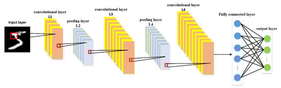 Convolutional neural networks (CNN) is based on multi-layer supervised learning and it requires a large amount of labeled data to complete model training by repeating forward propagation and backward propagation. CNN is usually composed of feature extractor and multilayer perceptron (MLP). The feature extractor consists of multiple alternating pooling and convolutional layers. The convolutional layer is to extract the features from input data, whereas the pooling layer is to decrease the feature dimension []. The fully connected MLP is classified according to the features learned by convolution and pooling layers. Figure 2 shows one typical model of convolutional neural networks, called Lenet, designed by Y. LeCun et al. []. The Lenet model has one input layer, three convolution layers, two pooling layers, one fully connected layer and one output layer, in which the convolutional layer and the pooling layer are alternately connected.
