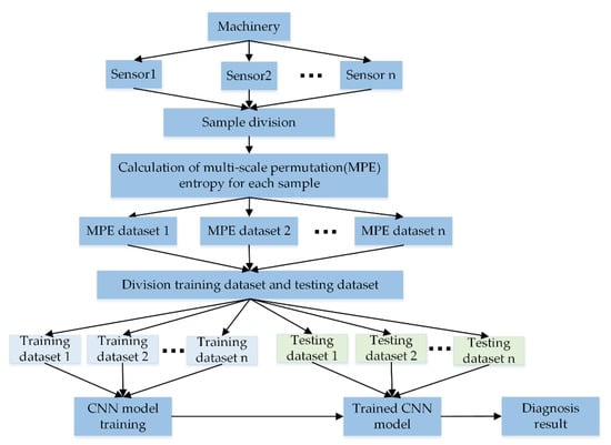 Nevertheless, the structure of mechanical equipment is very complex, and the interaction and coupling effect between the components make the vibration signal contain many inherent oscillation modes on different time scales []. Traditional CNN structure could not capture these inherent multi-scale features due to their lack of multi-scale feature extraction capabilities []. The multi-scale nonlinear analysis method proposed in recent years is proposed to extract fault features from multiple time scales to improve the fault diagnosis rate and achieve good results. For example, Zhang et al. [] used multi-scale entropy (MSE) to extract fault features from bearing vibration signals and input them to the adaptive neural fuzzy inference system (ANFIS), good diagnostic results were obtained. Yan et al. [] first used the improved multi-scale discrete entropy (MDE) to extract the fault feature from the vibration signal of rolling bearing, then used the max-relevance min-redundancy (mRMR) algorithm to select the sensitive feature from the multi-scale feature, and input them into the extreme learning machine (ELM) for classification. Zhao et al. [] decomposed the vibration signals of rolling bearings into a set of sub-band signals through wavelet packet decomposition (WPD), and calculated the multi-scale permutation entropy (MPE) values of all sub-band signals to form a feature vector, and then used HMM to identify the fault. Wu et al. [] combined MPE and support vector machine (SVM) method for bearing fault diagnosis. Experimental results show that compared with methods based on single-scale permutation entropy (PE) and MSE, the feature extraction method based on MPE has higher prediction accuracy. Moreover, MPE is more robust to the change of training sample size. In addition, some studies [,] have found that compared with MSE and MDE, MPE has faster calculation speed. Therefore, this paper uses MPE method to analyze the complexity of vibration signals on multiple scales, and feeds the MPE value to MCFCNN.