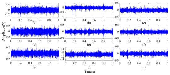 Raw vibration signals of the planet gear with atw monitored in nine directions under a load of 0.5 hp. (a–c) Signals detected with Sensor 1 in the directions of x, y and z axes; (d–f) Signals detected with Sensor 2 in the directions of x, y, and z axes; (g–i) Signals detected with Sensor 3, Sensor 4, and Sensor 5 in the x-axis direction.