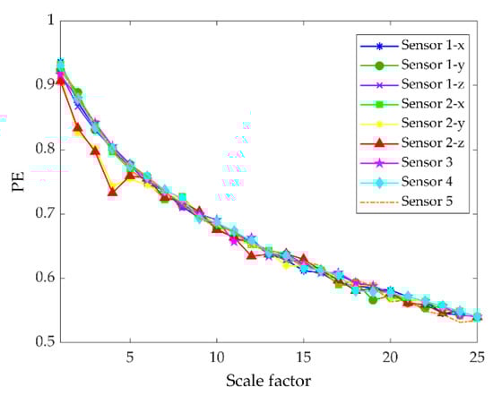 In the experiment, each sample contains 1024 data points, and the faulty planetary gear has no mesh within the sample length. Therefore, two 3-axis accelerometers and three 1-axis accelerometers were used to monitor vibration signals in nine directions, and the total number of samples for each state was 5400. Raw vibration signals of the planet gear with atw monitored in nine directions under a load of 0.5 hp are shown in Figure 6. We can see that the signals monitored at different positions contained different information. Combined with multi-sensor data, these signals could provide more information for fault diagnosis. Then, setting the coarse-grained scale factor , embedding dimension , and time delay to obtain MPE feature sets of the sample. The 25 scale MPE corresponding to the vibration signal of Figure 6 is shown in Figure 7. For each load, 480 samples in each direction were randomly selected as the training set. The remaining 120 samples were the testing set. Table 3 provides the three datasets under different loads.