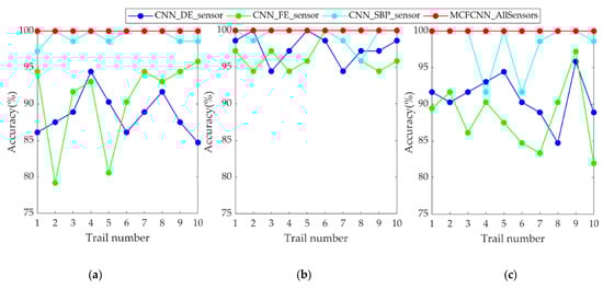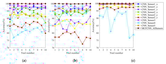 Diagnostic accuracy of ten experiments with single-channel CNN based on single-sensor data and MCFCNN based on multi-sensor data on test sets A (a), B (b), and C (c), respectively.