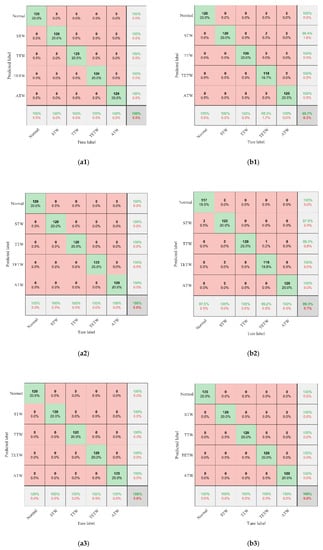To further assess the classification performance of MCFCNN, the diagnostic reliability of two diagnostic methods for each fault state of planetary gear was obtained with the confusion matrix. The confusion matrices of five fault states of MCFCNN and single-channel CNN are shown in Figure 9. The column and row of the confusion matrix represents, respectively, the prediction category and the real category. Green data at the last raw and the last column, respectively, indicate the precision of each fault state and the recall of each fault. The diagnosis results of each fault state can be obtained from the confusion matrix. Figure 9a1–a3 show the confusion matrices of MCFCNN for fault identification of datasets A, B, and C, and Figure 9b1–b3 show the confusion results of single-channel CNN for the fault identification of the datasets A, B, and C. As can be seen from Figure 9, the best diagnostic results of single-channel CNN still contain misdiagnosis. In the testing dataset A, the trained single-channel CNN misdiagnosed two samples with thtw as stw and had an accuracy rate of 99.7% and a total error of 0.3%. In the testing dataset B, one sample with thtw was misdiagnosed as the sample with ttw and three normal samples were misdiagnosed as stw and the trained CNN had an accuracy rate of 99.3% and a total error of 0.7%. MCFCNN can well diagnose different levels of wear faults, and the diagnostic accuracy reaches 100%.