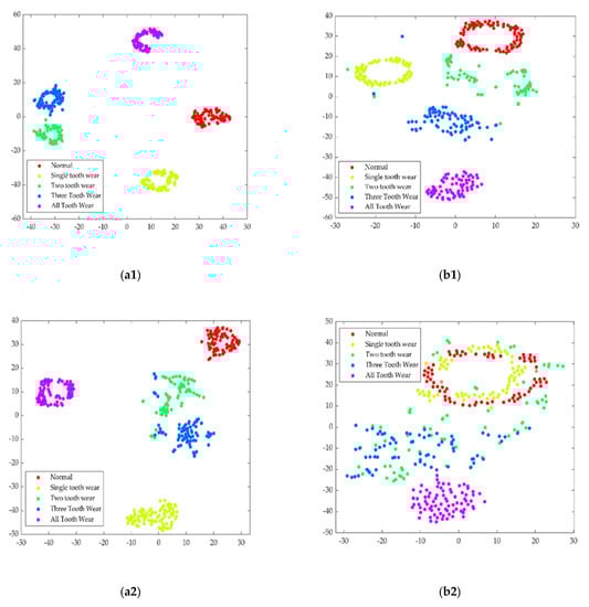 T-SNE visualization of features learned in the fully connected layer: (a1–c1) indicate the features of MCFCNN from testing datasets A, B, and C; (a2–c2) indicate the features of single-channel CNN from testing datasets A, B, and C.