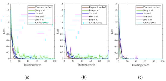 (a–c). An example of the training loss of comparative methods under the training sets A, B, and C.