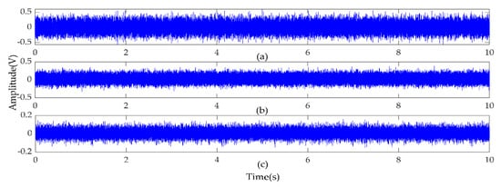 Vibration signal of rolling element fault with fault size of 7 mils. (a–c) are vibration signals monitored on the drive end, fan end and supporting base plate, respectively.
