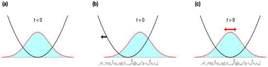 Schematic of the setup for a quantum harmonic oscillator with random disorder. (a) At , the disorder is off and the system is in the ground state with a Gaussian wavefunction. (b) At , the trap is abruptly displaced to the left, so the system gains an energy to move to the left. Disorder is on at this point. (c) At , the system oscillates left and right until it comes to equilibrium due to the disorder effect.