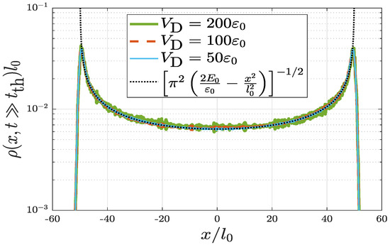Figure 2 shows the equilibrium real-space density distributions at . Three cases of disorder strength , , and are shown. The disorder correlation length and the initial velocity are fixed for all three cases. As shown, the three equilibrium distributions have almost overlapped with each other. It means that different finite disorder potential strengths lead to the same equilibrium distribution for the isolated quantum oscillator. Of equal importance, the distribution is very close to the microcanonical distribution for a classical harmonic oscillator. In a microcanonical ensemble of a classical harmonic oscillator with a given energy , the probability distribution in phase space is