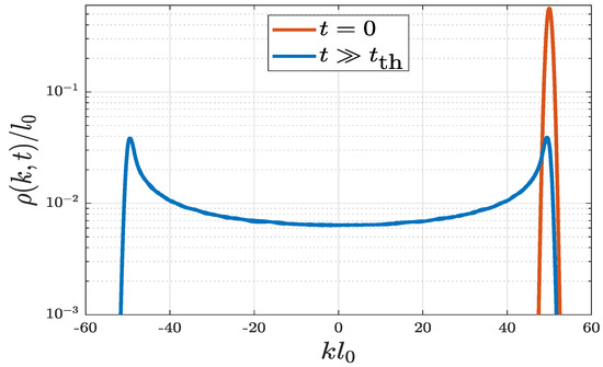 where is the Fourier transform of . As at before release, the real-space wavefunction is (see Equation (3)), and the corresponding initial momentum distribution is then , where is just a k-shift from , the Fourier transformation of . In fact, is also a Gaussian function. The initial momentum distribution is shown by the red curve in Figuer Figure 3. Figure 3 shows only the case with . When the system reaches equilibrium (), the numerically solved momentum distribution is shown by the blue curve in Figure 3, featuring two peaks at the high-k turning points. When comparing the and momentum distributions in Figure 3, it is important to note the following. (i) The case of is asymmetric which implies a nonequilibrium state; the case of is symmetric which implies an equilibrium state. (ii) Through the effect of random disorder, initial mechanical energy has been transformed to thermodynamic energy at equilibrium, which is distributed among different k states in a wide range up to the cut-off turning points.