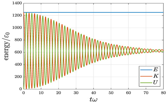 One important feature shown in Figure 4 is that when the system reaches equilibrium, thermodynamic energy E is evenly distributed in K and U. Thus, at equilibrium the virial theorem is satisfied: . This is analogous to the case for a classical harmonic oscillator, the time-averaged . Moreover, for the present system, the equilibrium temperature can be obtained as . In view of the static value shown in Figure 4, , it is identified that .