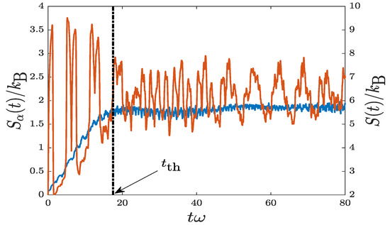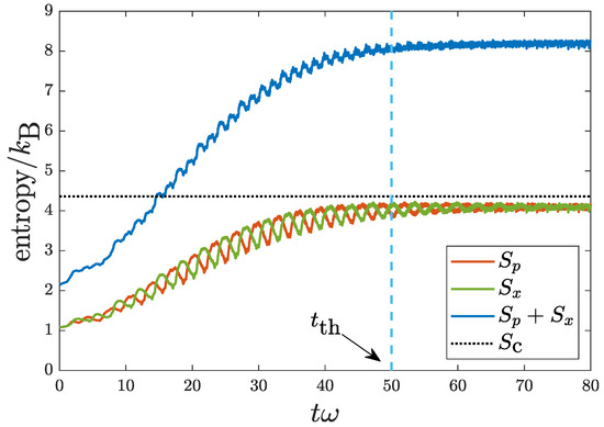Figure 5 shows the evolutions of both and . Taking into account all possible phase spaces, the result of sum of the two, , is also shown. While the parameters used, and , are just a numerical trial, they are close to those of a real experimental set-up with and [10]. In addition, we consider a shorter disorder correlation length . All three cases consistently show the increase of entropy for the thermalization process, and they maximize (saturate) when the system approaches equilibrium. Therefore, the use of Shannon entropy is suitable to describe the thermalization process in the current isolated quantum system. In Figure 5, the black dotted line corresponds to the Shannon entropy for a classical harmonic oscillator in a microcanonical ensemble. It is obtained by substituting the real-space density distribution in Equation (8) into in (15). In view of Figure 5, the thermalization time in this case after which the system reaches equilibrium can be unambiguously identified to be .