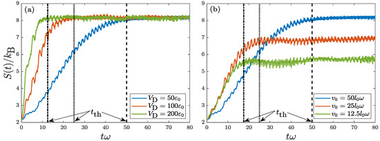 Evolutions of Shannon entropy for a quantum harmonic oscillator with random disorder. Frame (a) considers the effect of disorder potential strength with fixed and . Frame (b) considers the effect of initial velocity with fixed and . The corresponding thermalization times are identified.