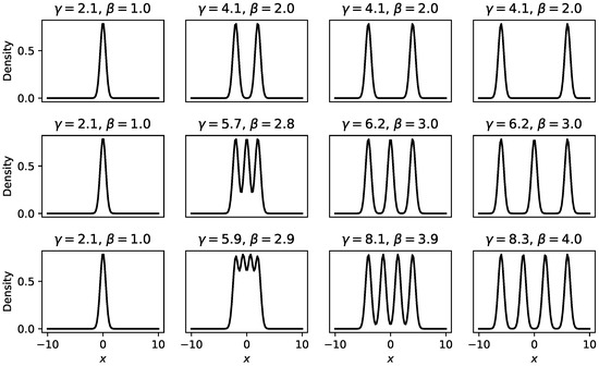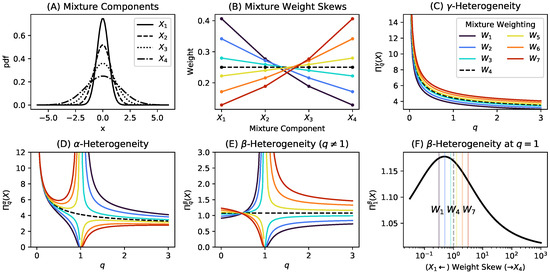(Decomposition of Rényi Heterogeneity in a Parametric Gaussian Mixture). Consider a parametric Gaussian mixture X with four components defined on (for instance, Figure 2A). The components’ respective standard deviations are . We vary the column vector of mixture component weights according to the following function: