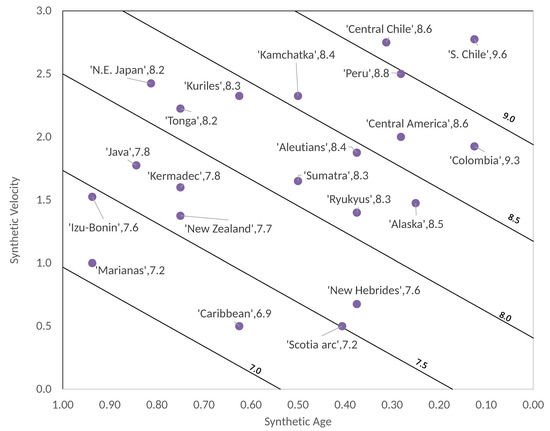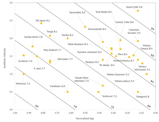 | Subduction Seismic Region | Subduction Rate V (cm/Year) | Magnitude of the Maximum Reported Earthquake | Age (Myr) | Calculated |
