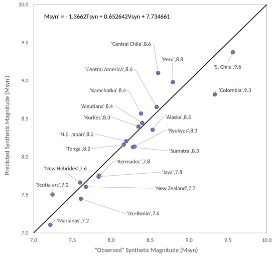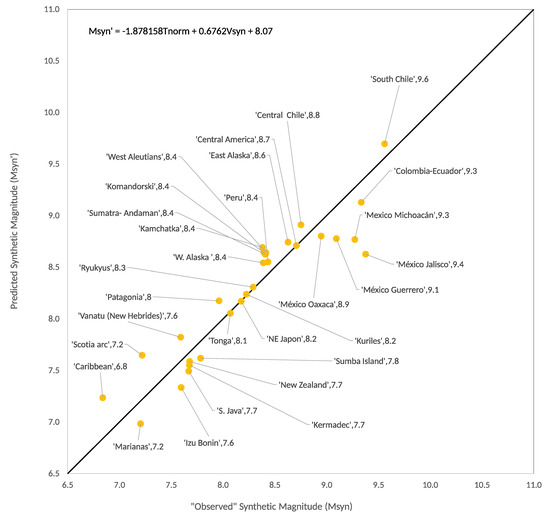 | Subduction Seismic Region | Tsyn (Gamma) | Normalized Age en | Vsyn | Maximum Size (m) of Synthetic Earthquake | Observed | Predicted Msyn′ |