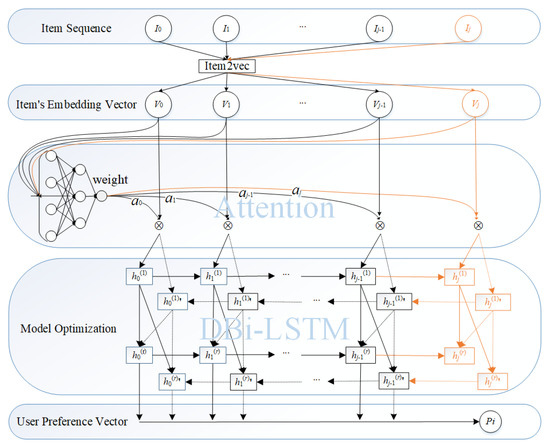 Algorithm 2 is to feed the item’s embedding vectors corresponding to the user item sequence into deep Bi-LSTM, which generated the user preference vector by optimization of the model.